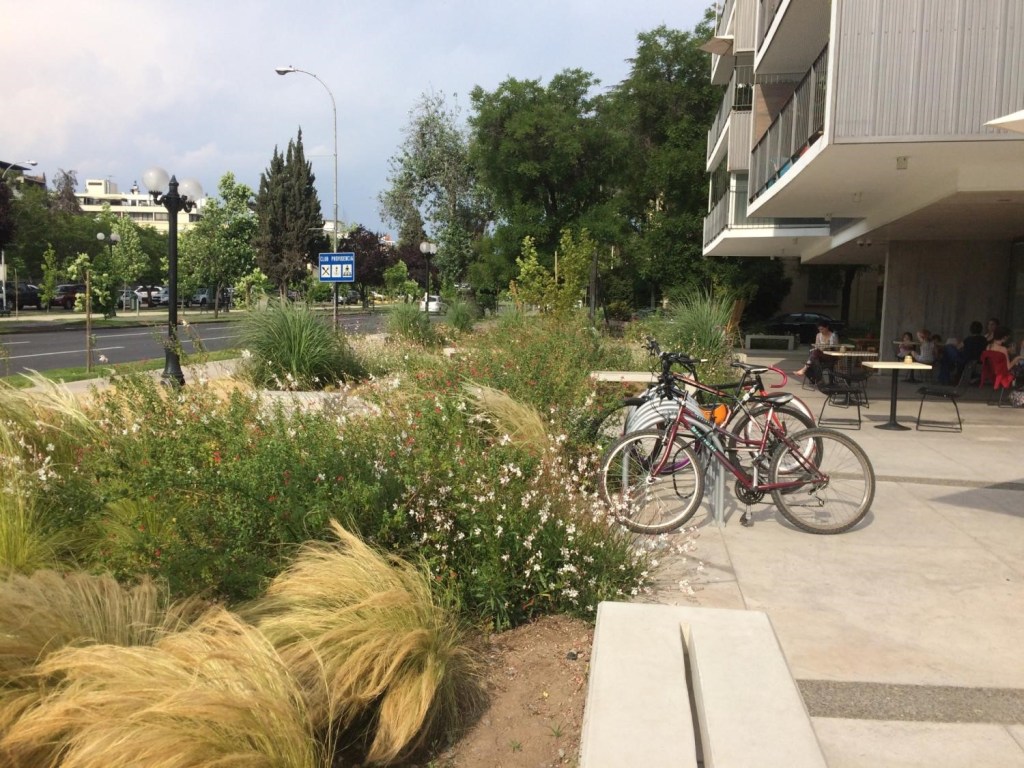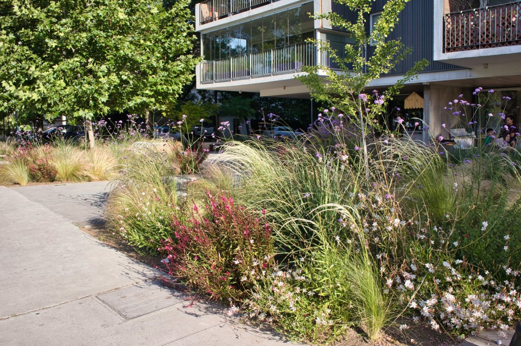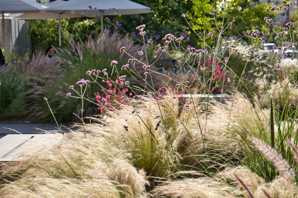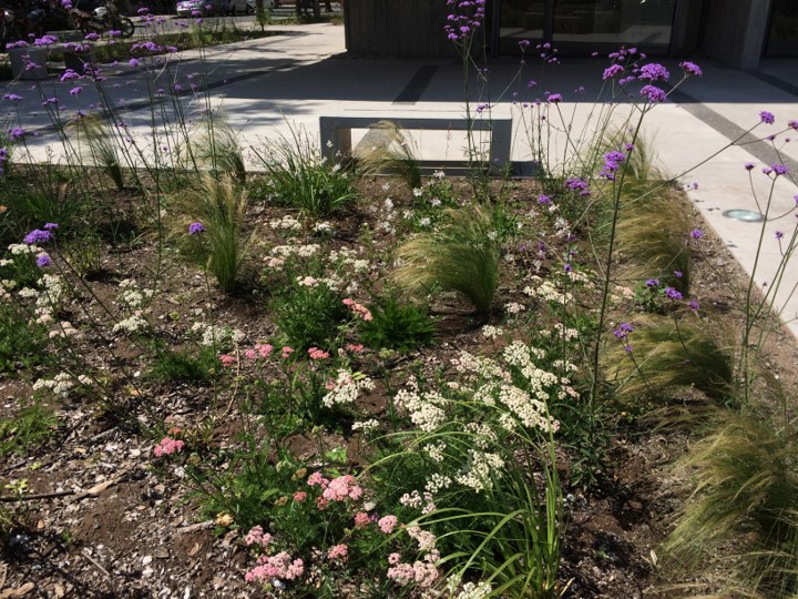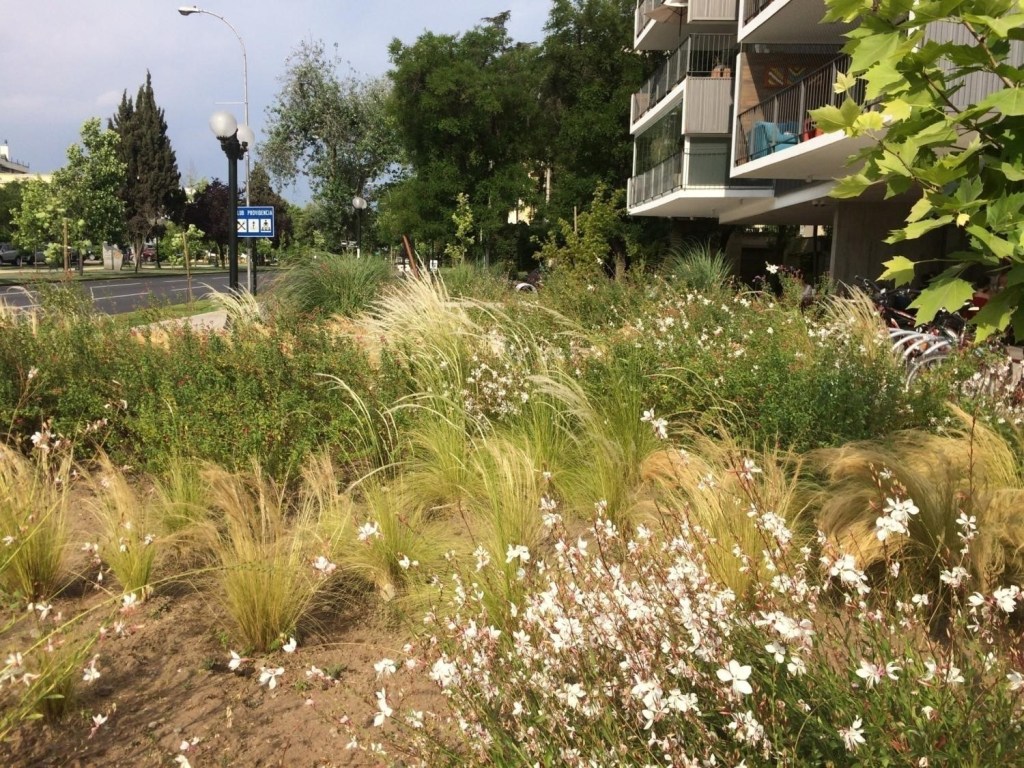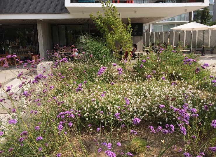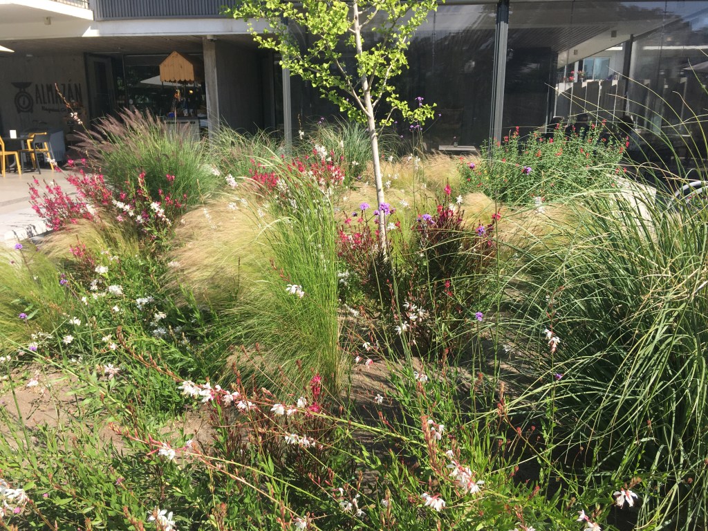 La vegetación usada se lleva a la paleta de herbáceas de amplia floración, de aspecto silvestre e informal, evitando un ambiente de arbustos compactos propios de jardín de edificio en este barrio. Se destaca el uso de verbena bonariensis y achillea millefolium asociadas.