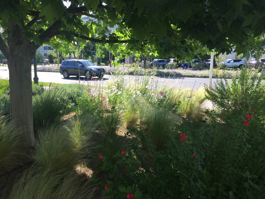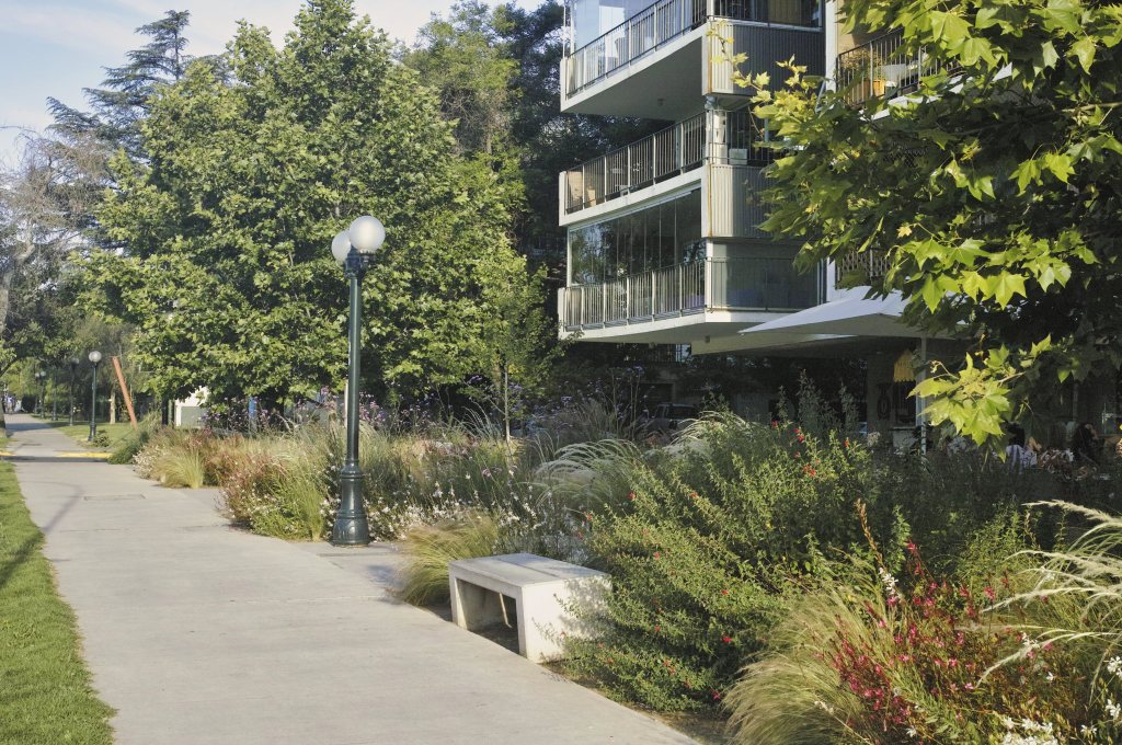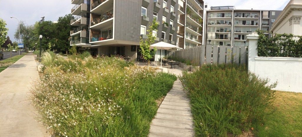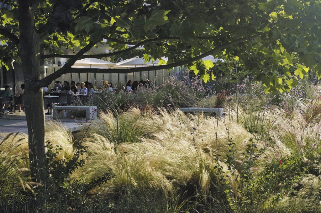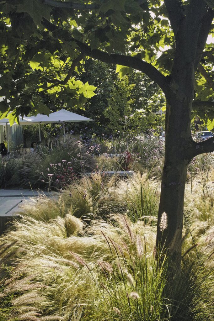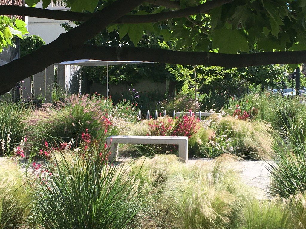 La vegetación usada se lleva a la paleta de herbáceas de amplia floración, de aspecto silvestre e informal, evitando un ambiente de arbustos compactos propios de jardín de edificio en este barrio. Se destaca el uso de verbena bonariensis y achillea millefolium asociadas.