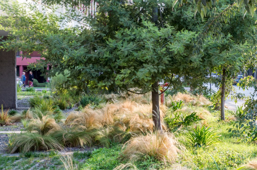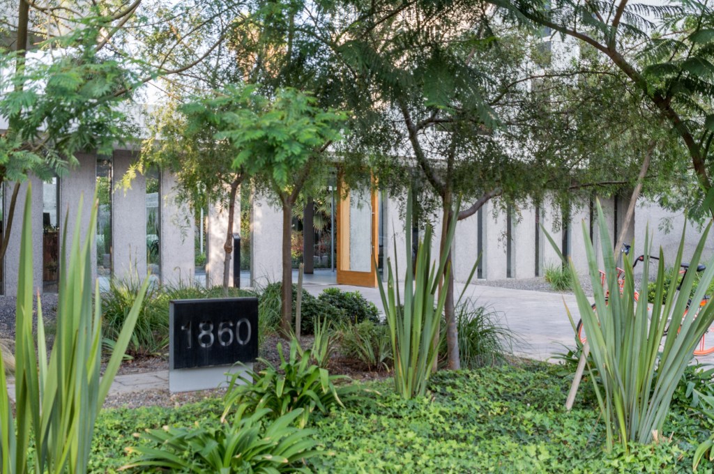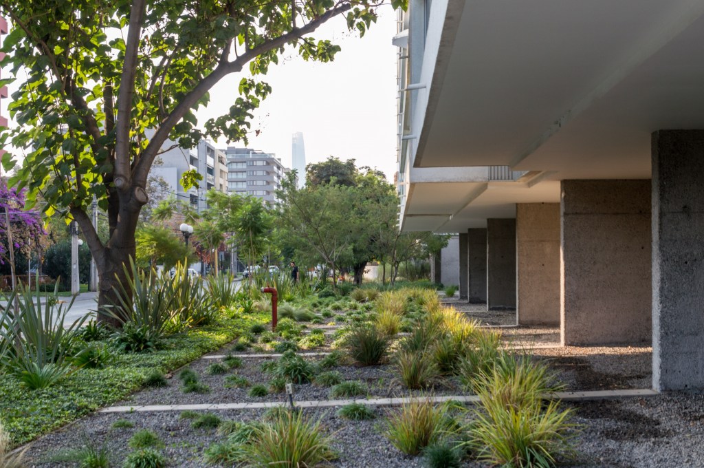 El edifico residencial tiene un amplio antejardín esquina, que se ocupa con diferentes estratas de plantas siempreverdes y arboles que protegen del sol poniente.