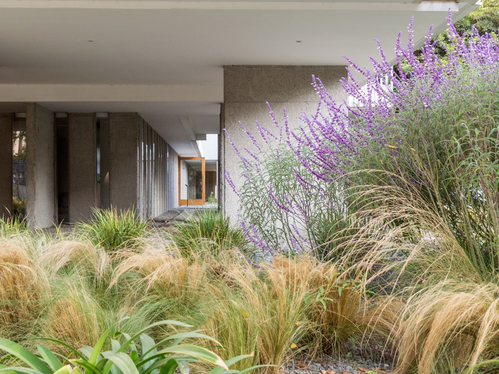 Hacia el jardín interior, se deja solo el pasto necesario frente a los espacios comunes y el resto se aborda como patios de gravilla con jardineras variadas.