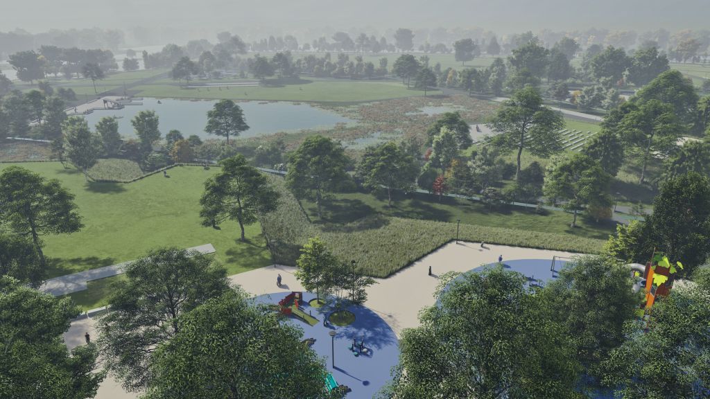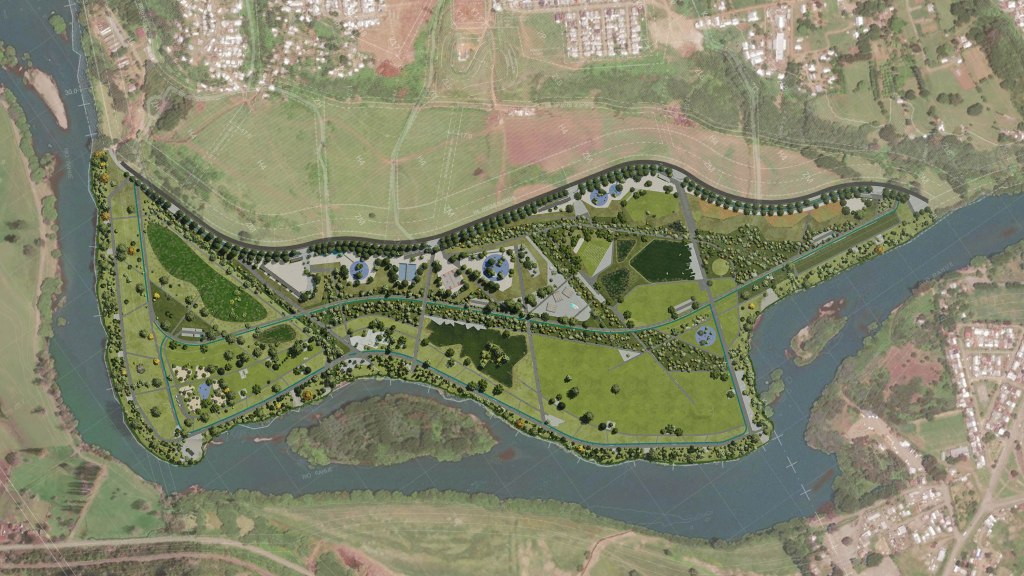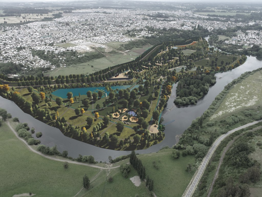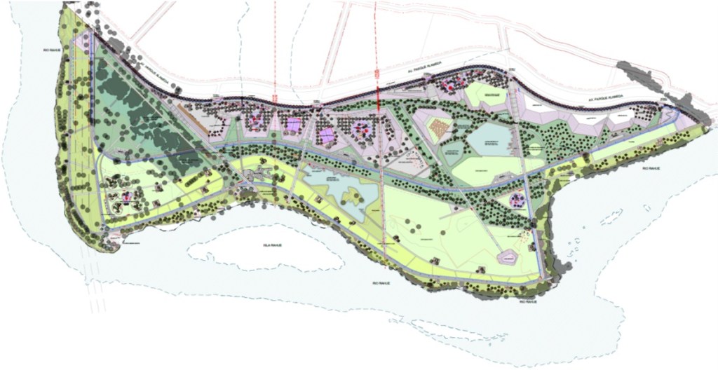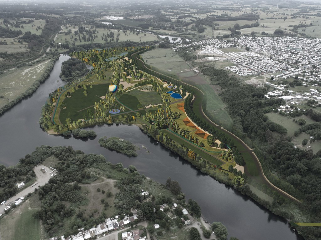 Parque publico de 45 ha en la comuna de Osorno que se hace cargo de un terreno ocasionalmente inundable en el borde norte del rio Rahue. Se construye una gran terraza en lo mas alto del terreno donde se instala todo el equipamiento del parque, y se deja la zona baja (4m bajo la terraza) como área parque silvestre y de inundación, poniendo así a salvo la inversión en infraestructura del parque.