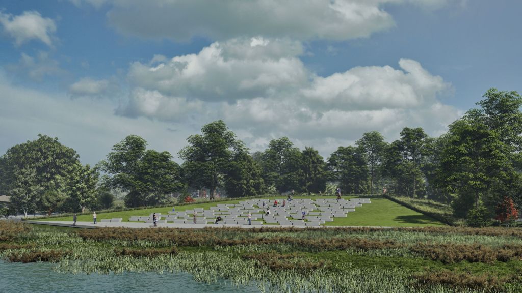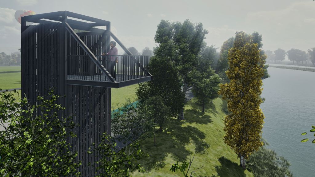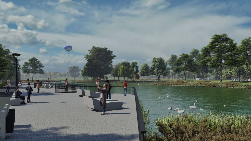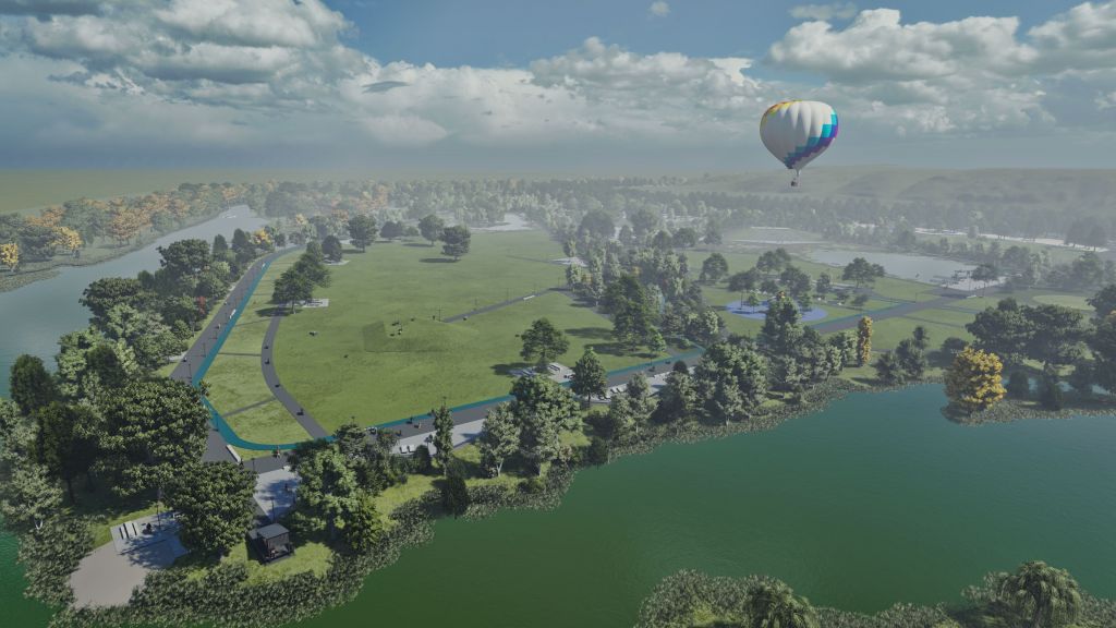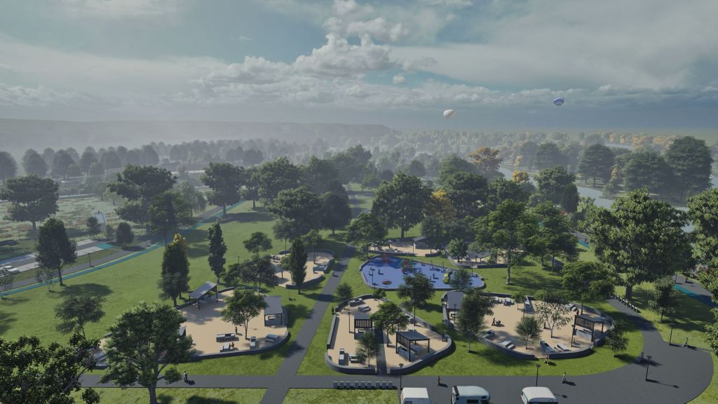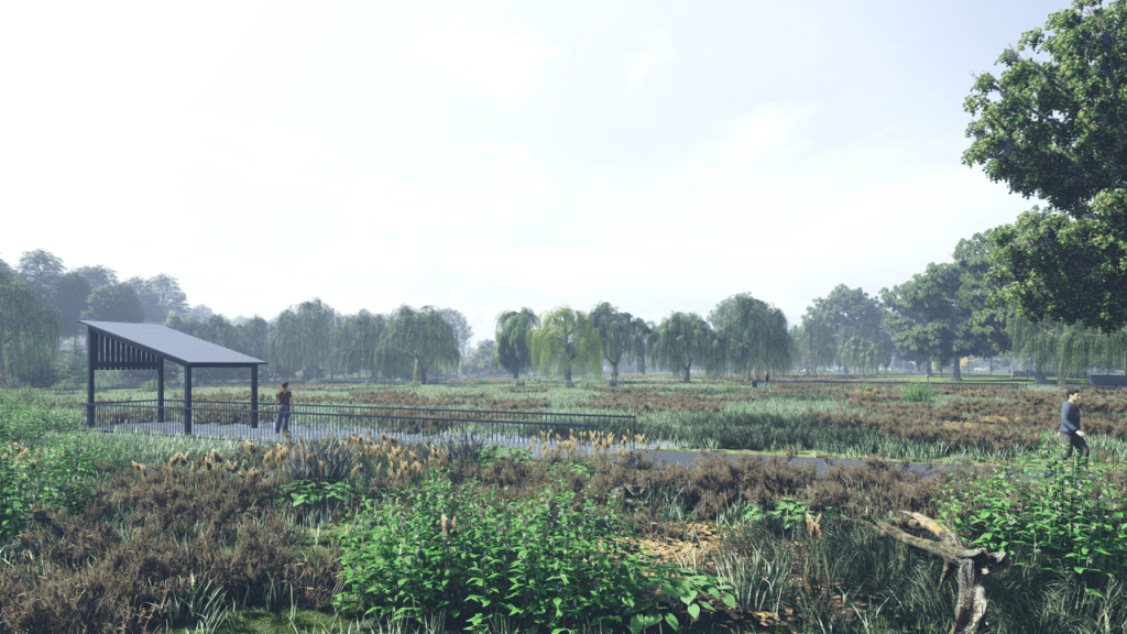 Parque publico de 45 ha en la comuna de Osorno que se hace cargo de un terreno ocasionalmente inundable en el borde norte del rio Rahue. Se construye una gran terraza en lo mas alto del terreno donde se instala todo el equipamiento del parque, y se deja la zona baja (4m bajo la terraza) como área parque silvestre y de inundación, poniendo así a salvo la inversión en infraestructura del parque.