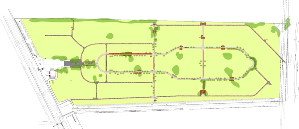 Plan maestro para ordenar las circulaciones y áreas de descanso dentro del cementerio, poniendo en valor los arboles antiguos existentes en el terreno. Además se aprovecha para definir nuevas áreas de sepultación.