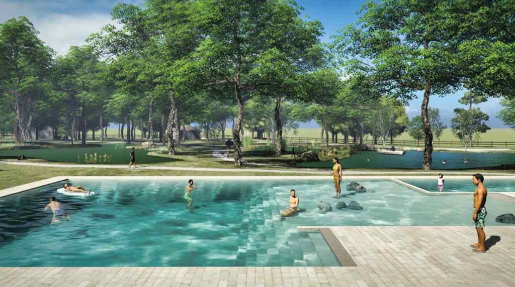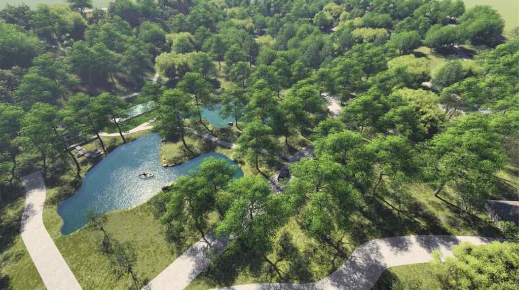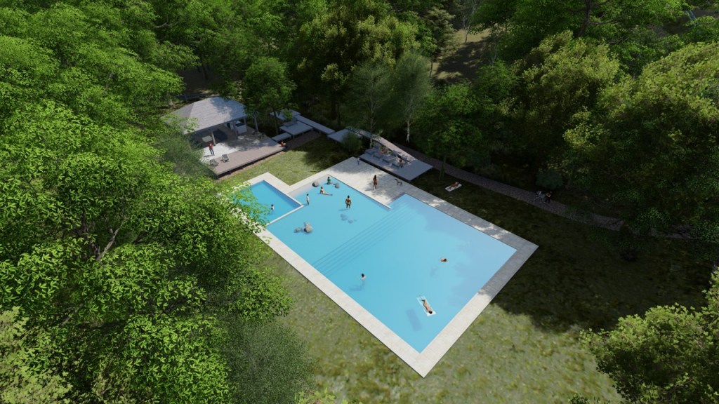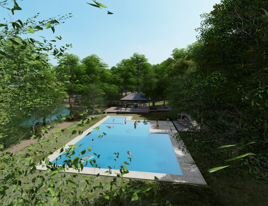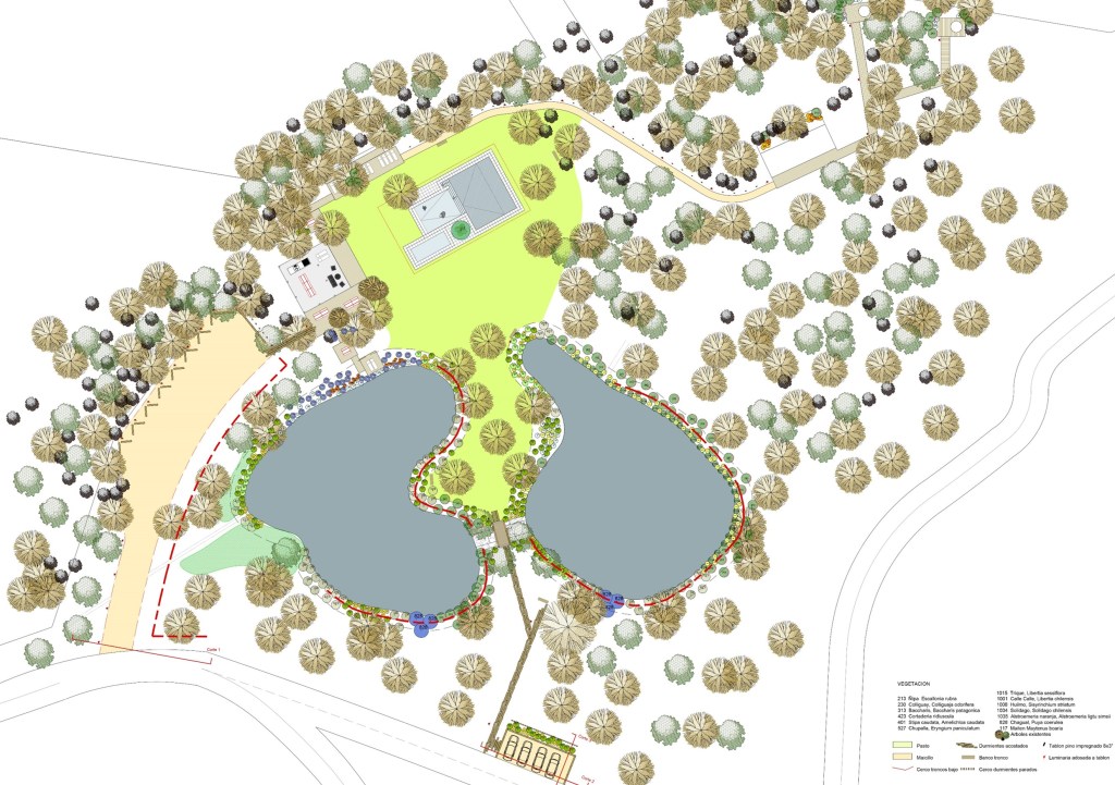 Los sitios se desarrollan principalmente en la ladera, y las áreas comunes en la zona baja. Se ha construido un quincho acompañado de un área de piscina y jardines. Las lagunas adyacentes, reservas para riego, también forman parte de este paisajismo, dominado por vegetación nativa, de acuerdo con el espíritu de conservación del proyecto.