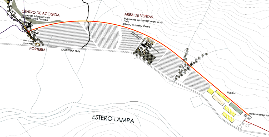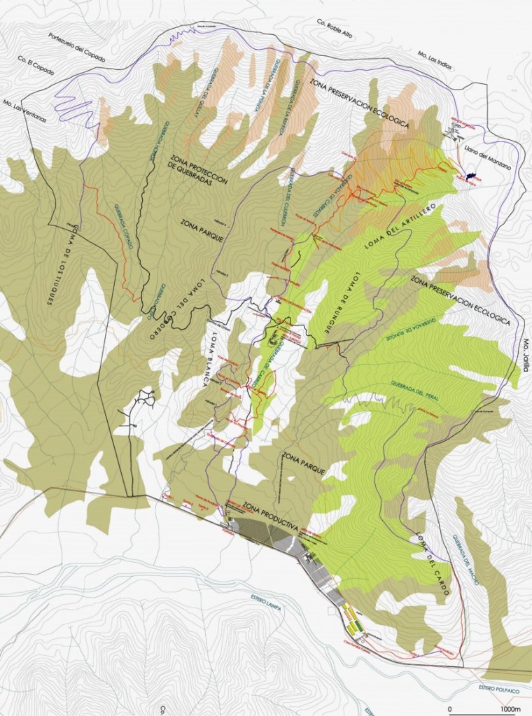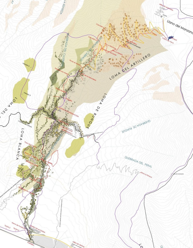 Se propone una gradiente de usos, donde en las zonas bajas se emplazan todos los usos mas masivos (ferias, estacionamientos, centro de interpretación ambiental) para ir dejando muy pocos equipamientos a medida que sube el nivel y la densidad del bosque esclerófilo.