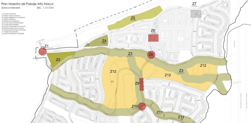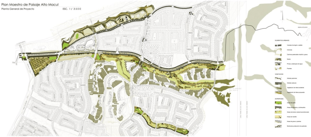Por el lado norte, el proyecto limita con la quebrada de Macul, donde se propone un parque con una colina de borde artificial producto de los descarpes de la construcción de calles y viviendas. Es una sucesión de terrazas a distintos niveles que emplazan equipamientos deportivos para la urbanización.