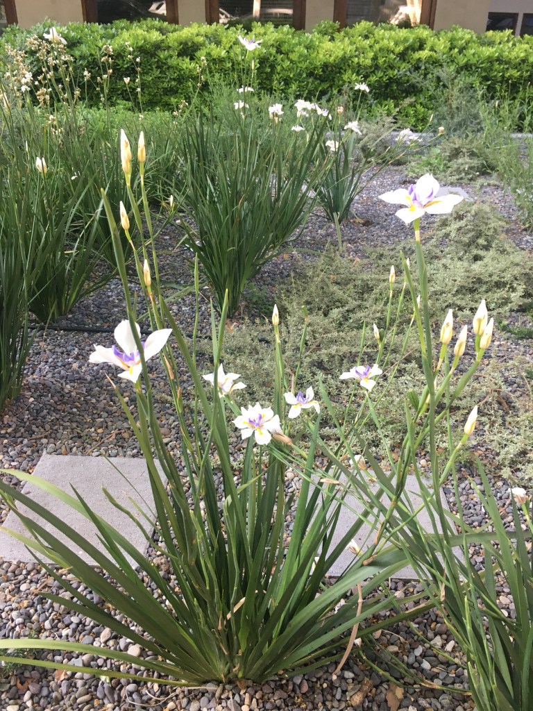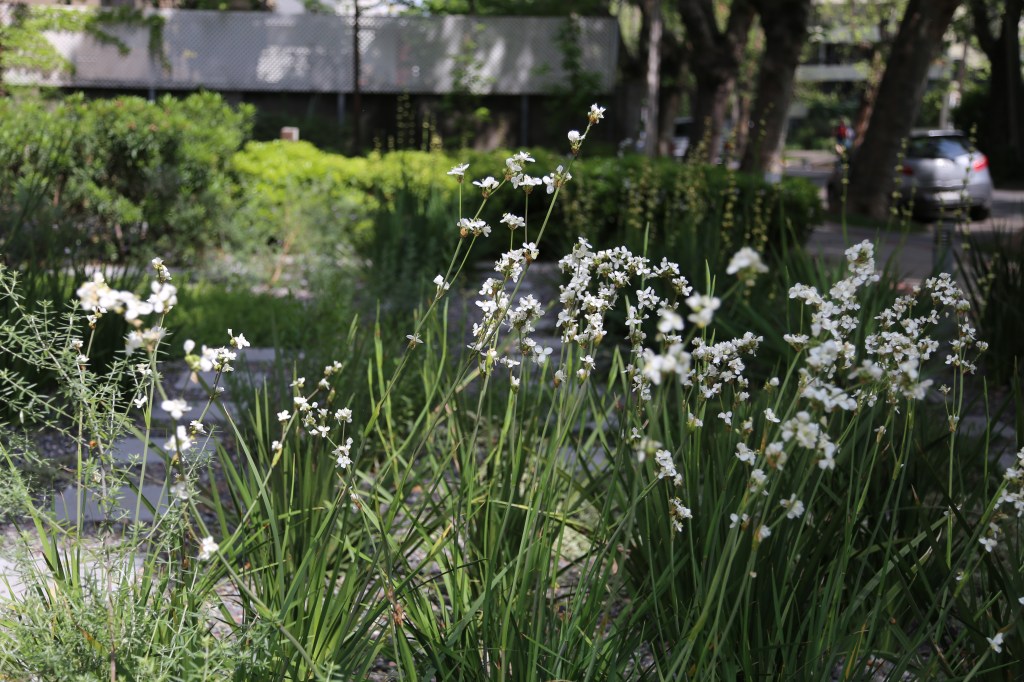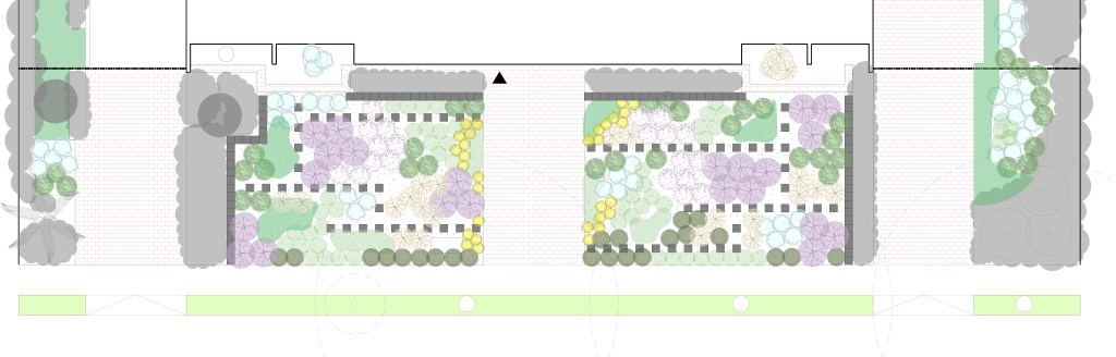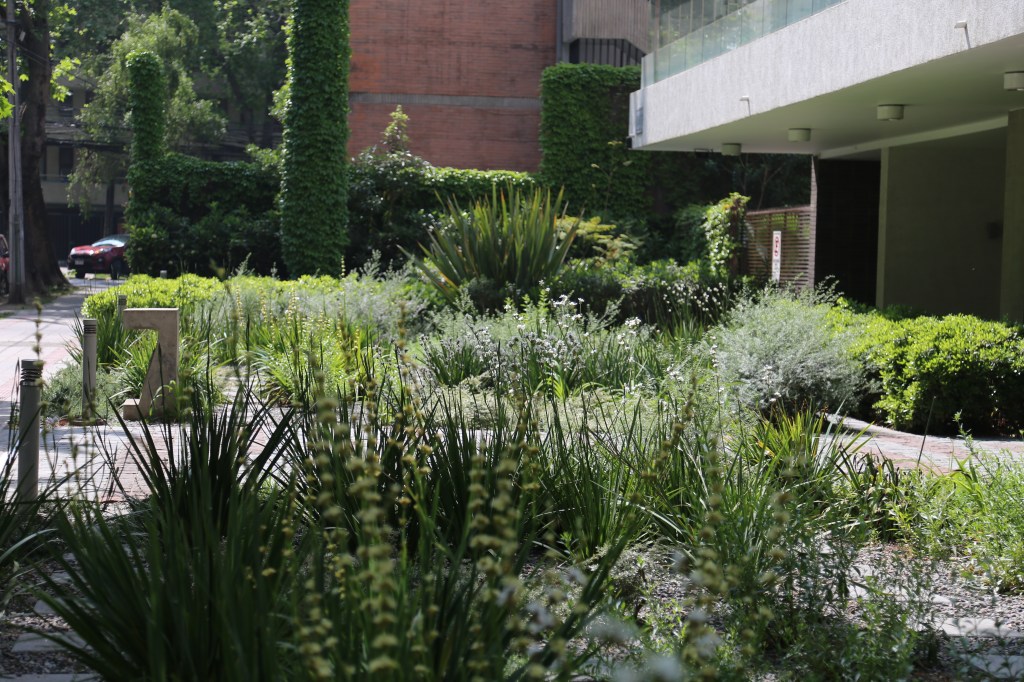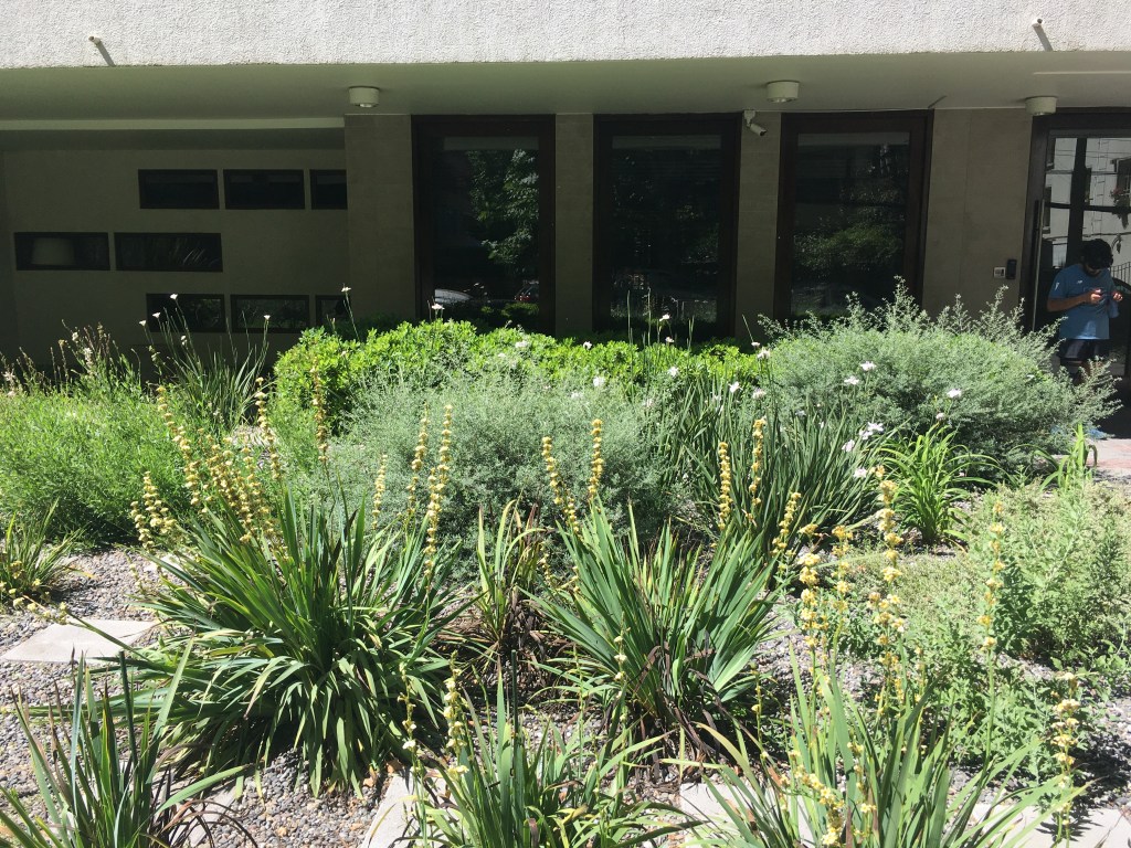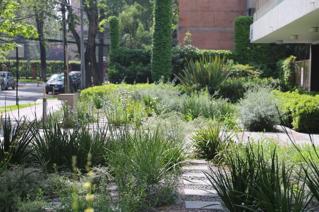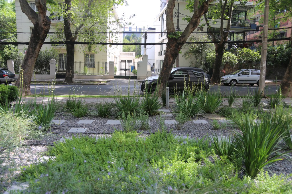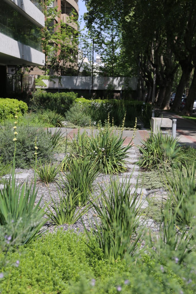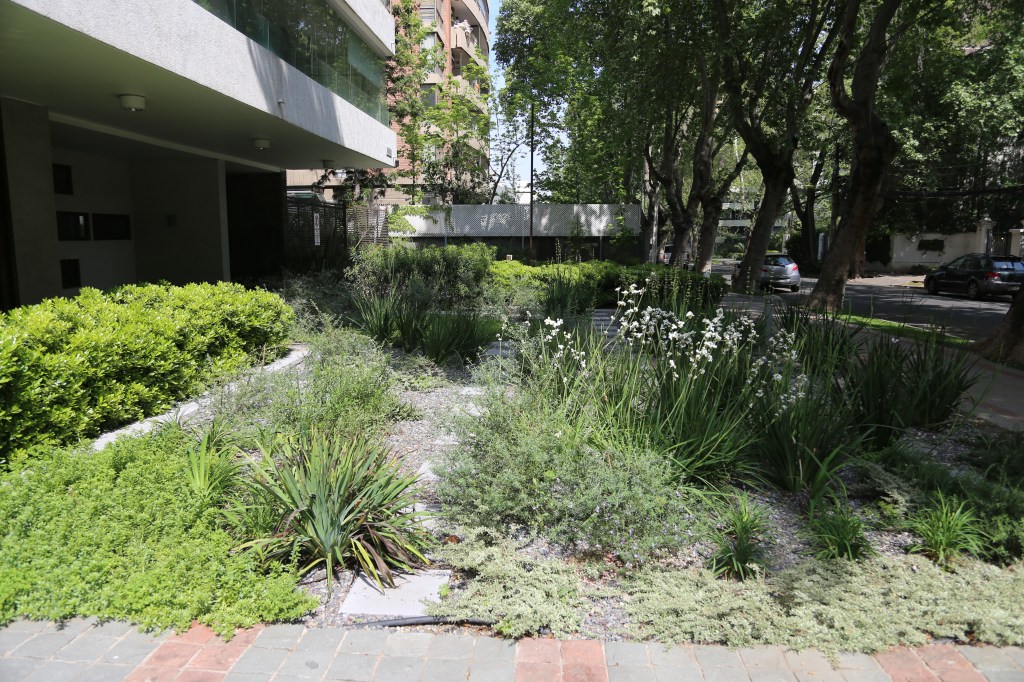 El objetivo de la remodelación del antejardín fue quitar el pasto y bajar el consumo de agua potable. Para esto se dispuso un jardín de un 80% de cobertura del suelo, dejando senderos para mantención y agrupando las plantas por especies, creando sucesivas oleadas de floración: huilmos, calle calle, dietes, gauras, perovskia y hemerocalis se suceden en la primavera y verano. El suelo de gravilla cubre todos los espacios libres y será parcialmente cubierto por cubresuelos como coprosma kirkii, romero rastrero y mioporo rastrero. El jardín esta en desarrollo, pudiendo poner nuevas especies y colores, observando su comportamiento en el tiempo.